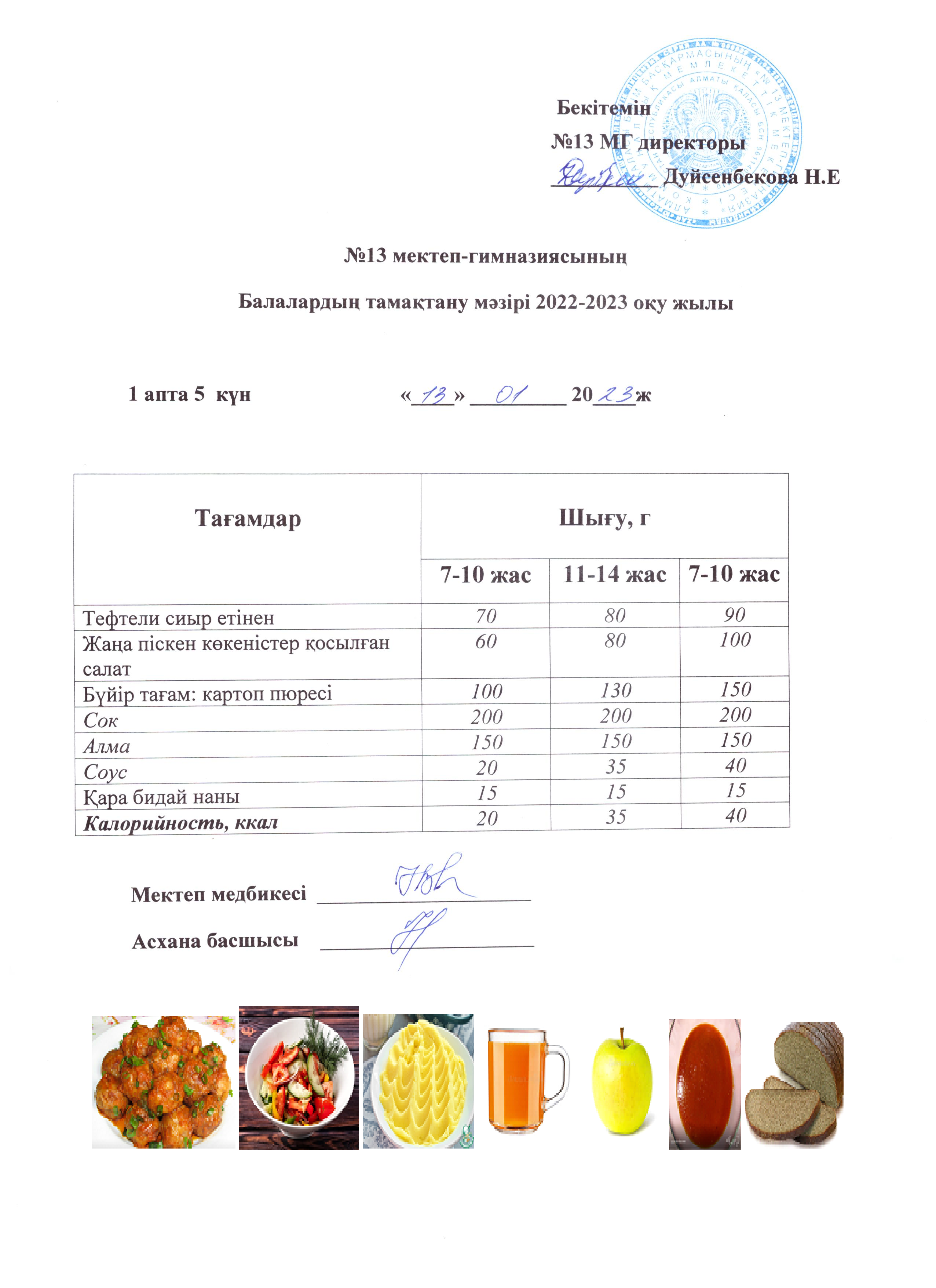 13 қаңтар 2023 0 1 2 3 4 5 Күнделікті ас мәзірі 1 апта 5 күн 13.01.2023 Осы беттің QR-коды:QR-код этой страницы: