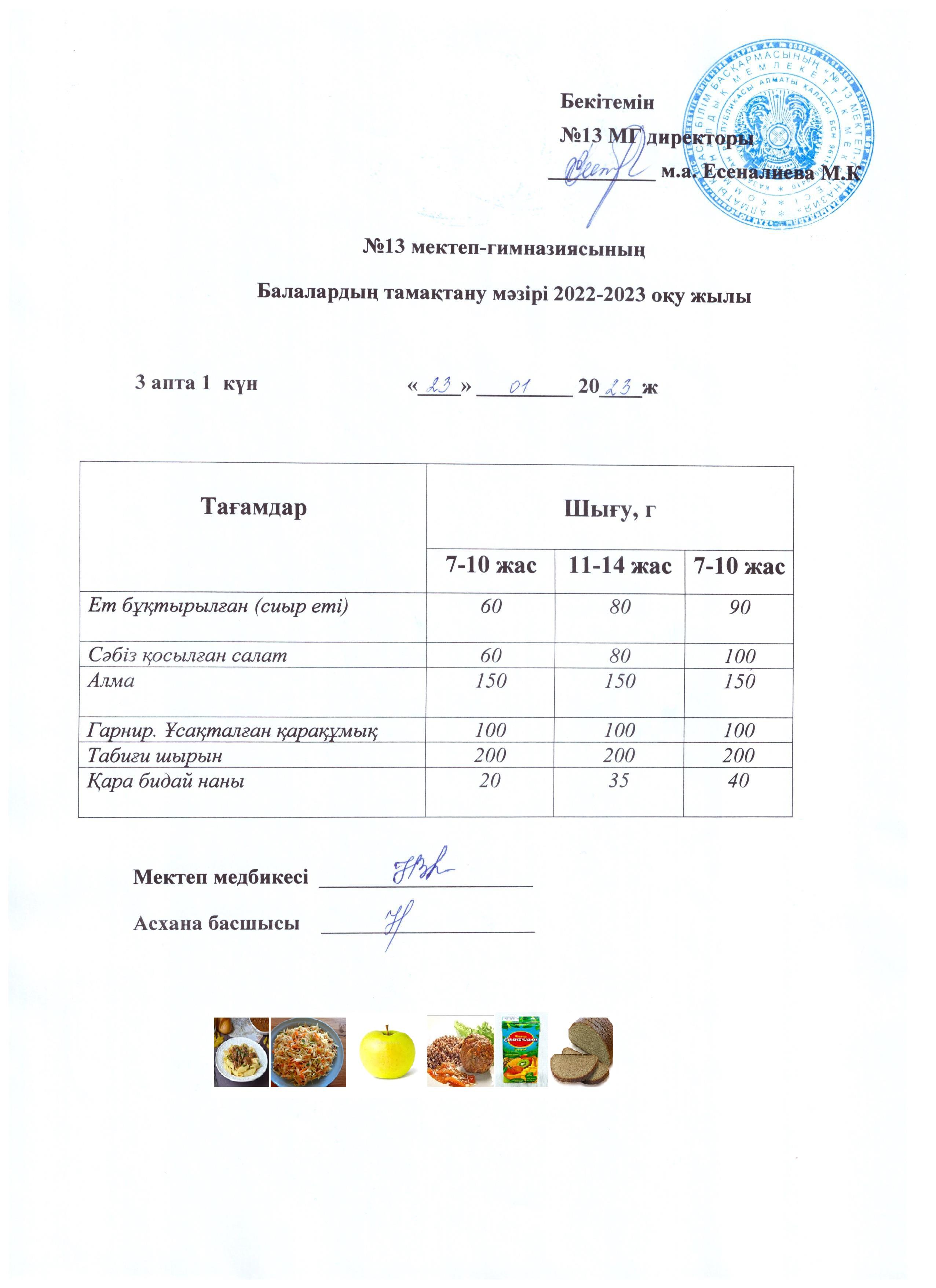 23 қаңтар 2023 0 1 2 3 4 5 Күнделікті ас мәзірі 3 апта 1 күн 23.01.2023 Осы беттің QR-коды:QR-код этой страницы: