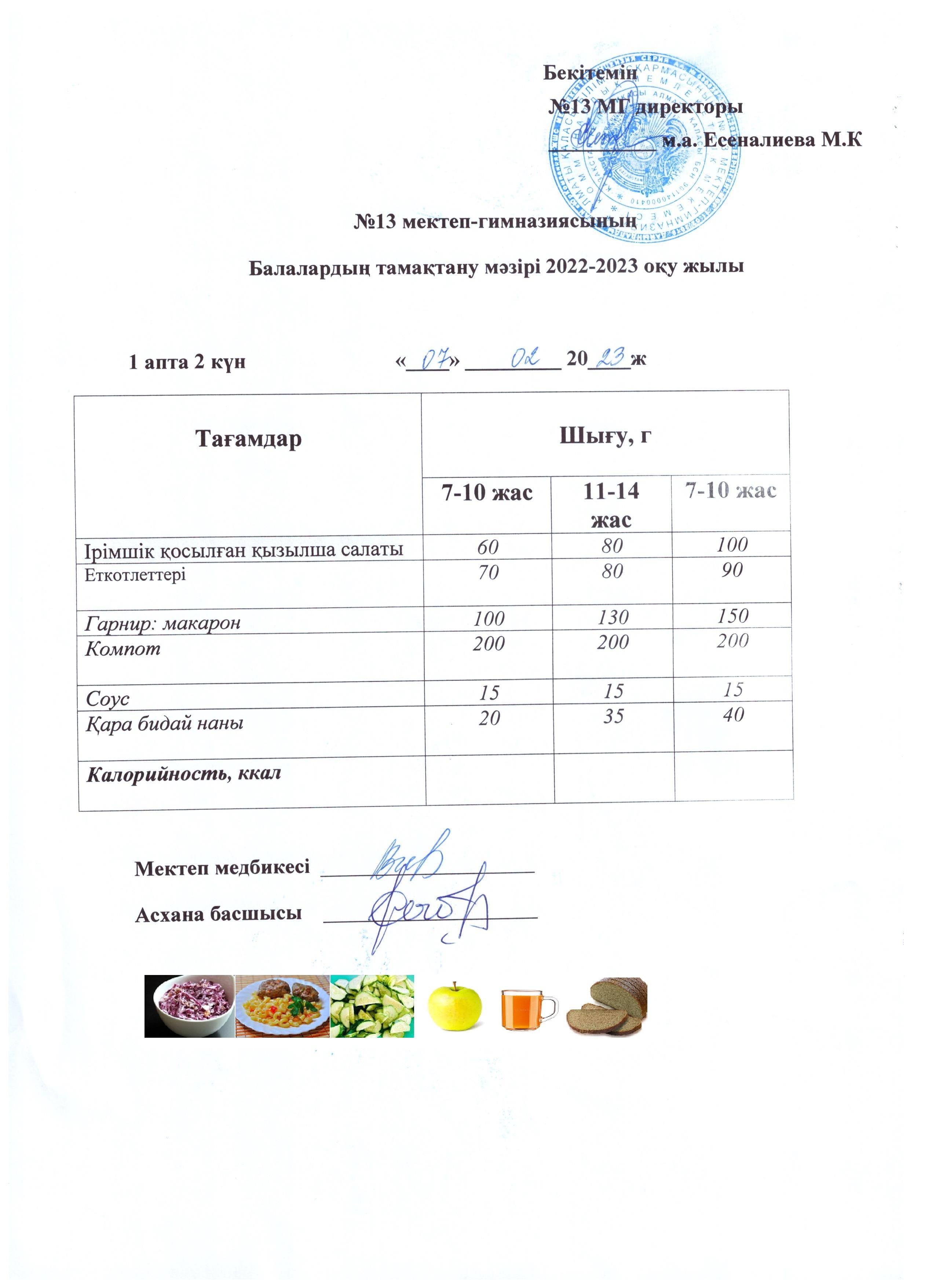 07 ақпан 2023 0 1 2 3 4 5 Күнделікті ас мәзірі 1 апта 2 күн 07.02.2023 Осы беттің QR-коды:QR-код этой страницы: