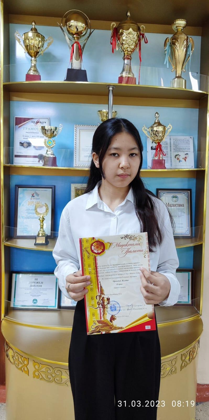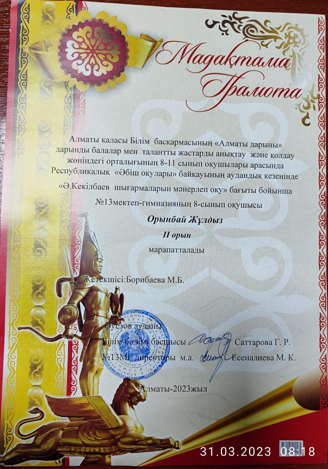Алматы қаласы Әуезов ауданы √13 мектеп-гимназиясының 8"Б" сынып оқушысы Орынбай Жұлдыз Алматы қаласы білім басқармасының "Алматы дарыны" дарынды балалар мен талантты жастарды анықтау және қолдау жөніндегі орталығының 8-11 сынып оқушылары арасында Республикалық "Әбіш оқулары" байқауының аудандық кезеңінде "Ә.Кекілбаев шығармаларын мәнерлеп оқу" бағыты бойынша қатысып, жүлделі ІІ орын иеленді.