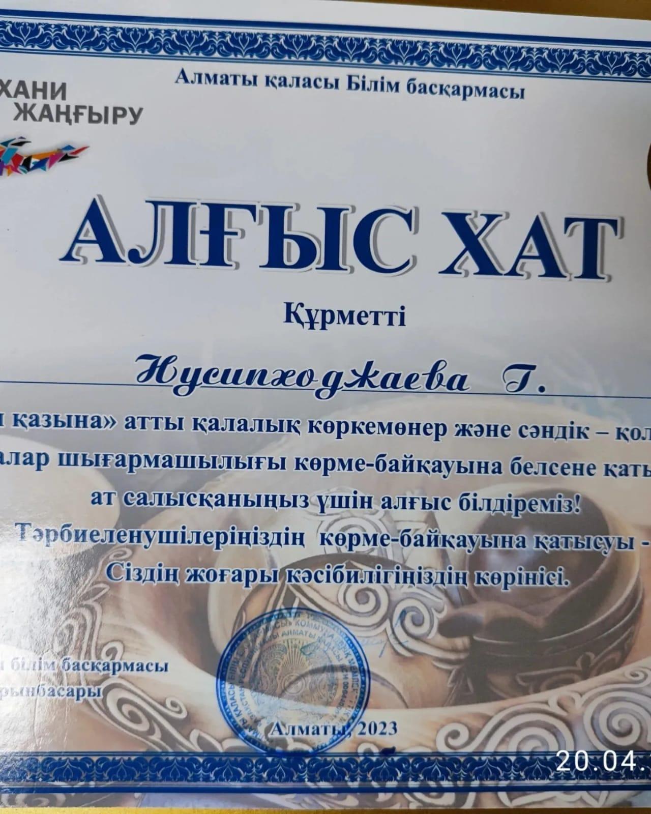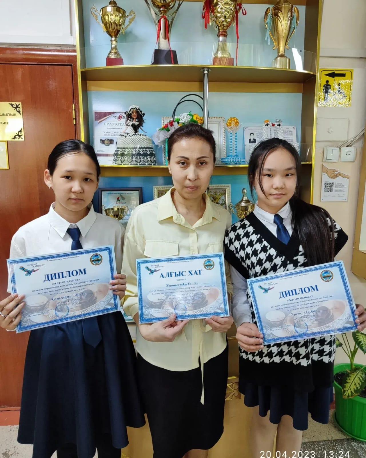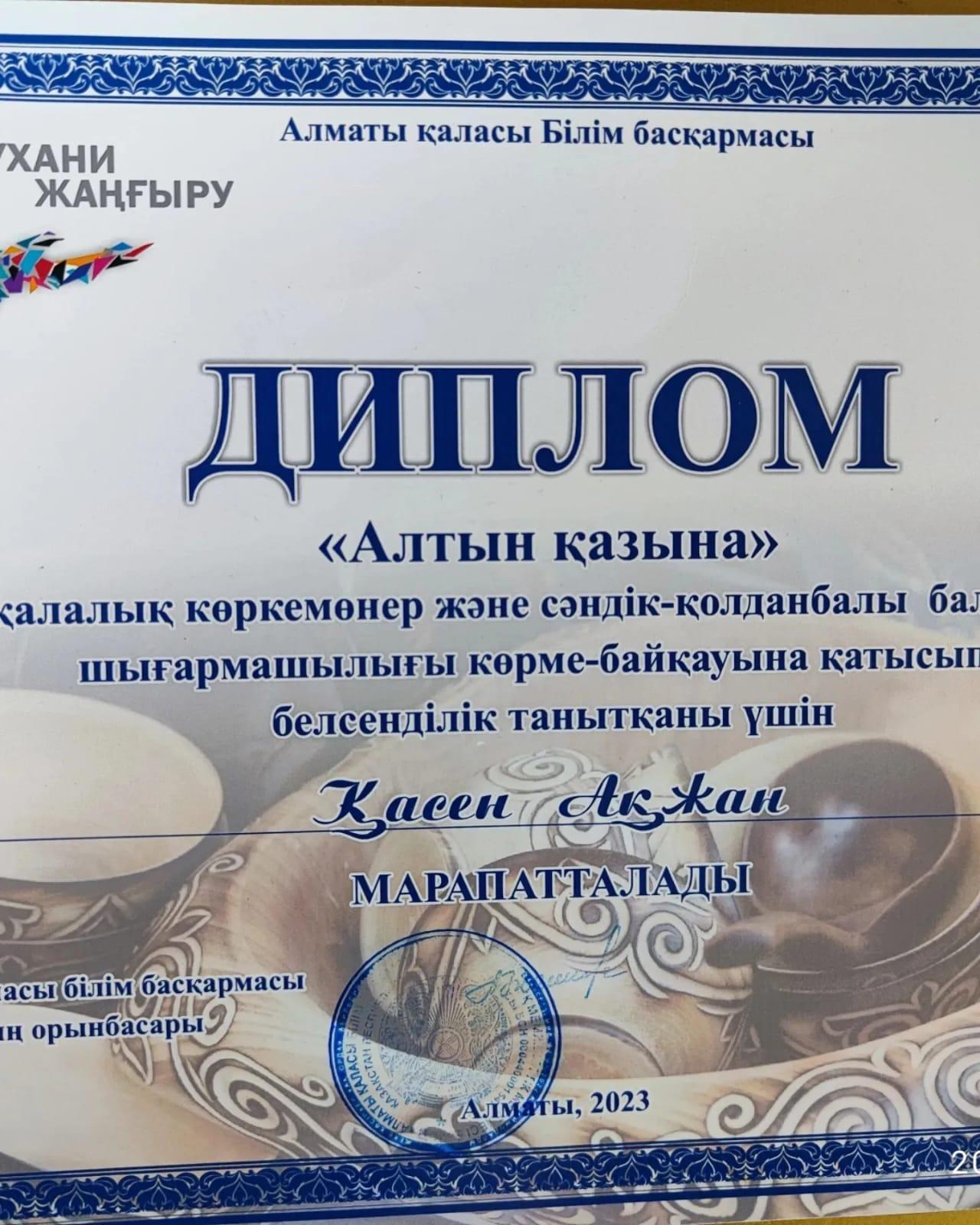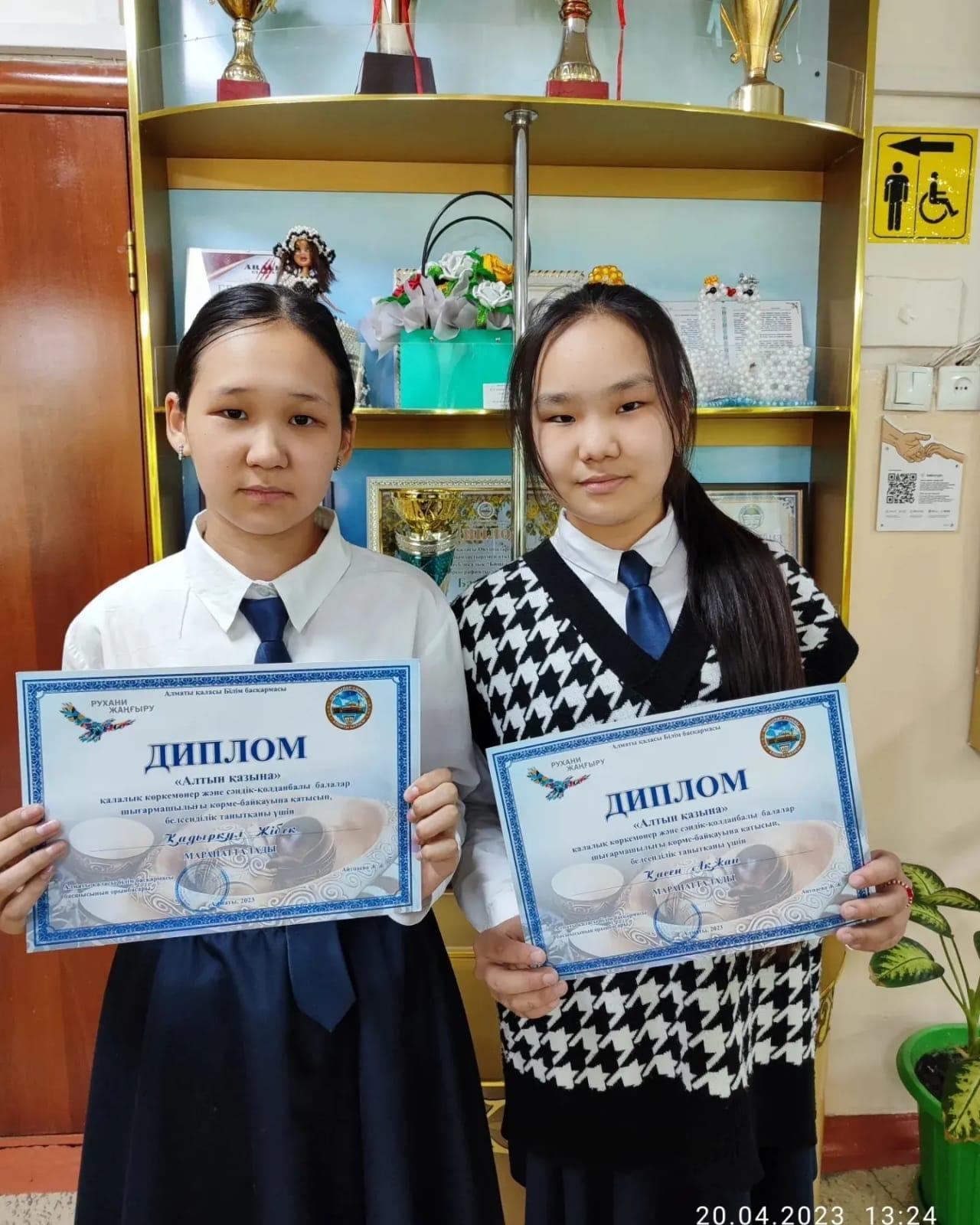 Алматы қаласы Әуезов ауданы √13 мектеп-гимназиясының 6"Ә" сынып оқушылары Қадырқұл Жібек пен Қасен Аяжан "Алтын қазына" қалалық көркемөнер және сәндік-қолданбалы балалар шығармашылығы көрме-байқауына қатысып, белсенділік танытқаны үшін марапатталды.Жетекшісі: Нусипходжаева Гульзира