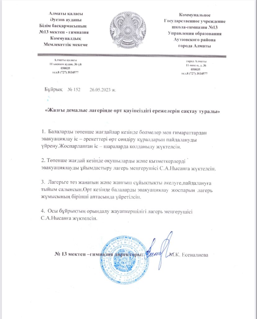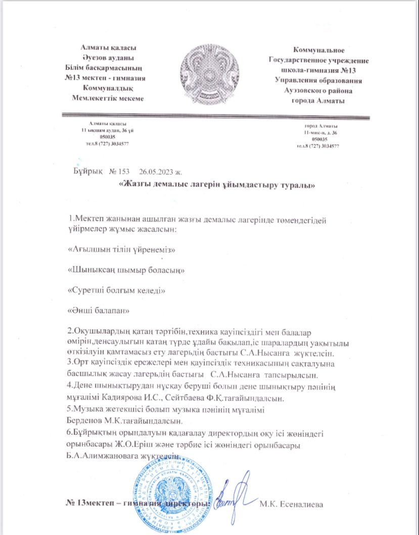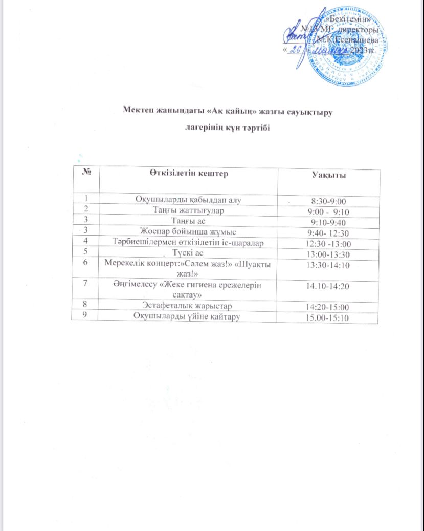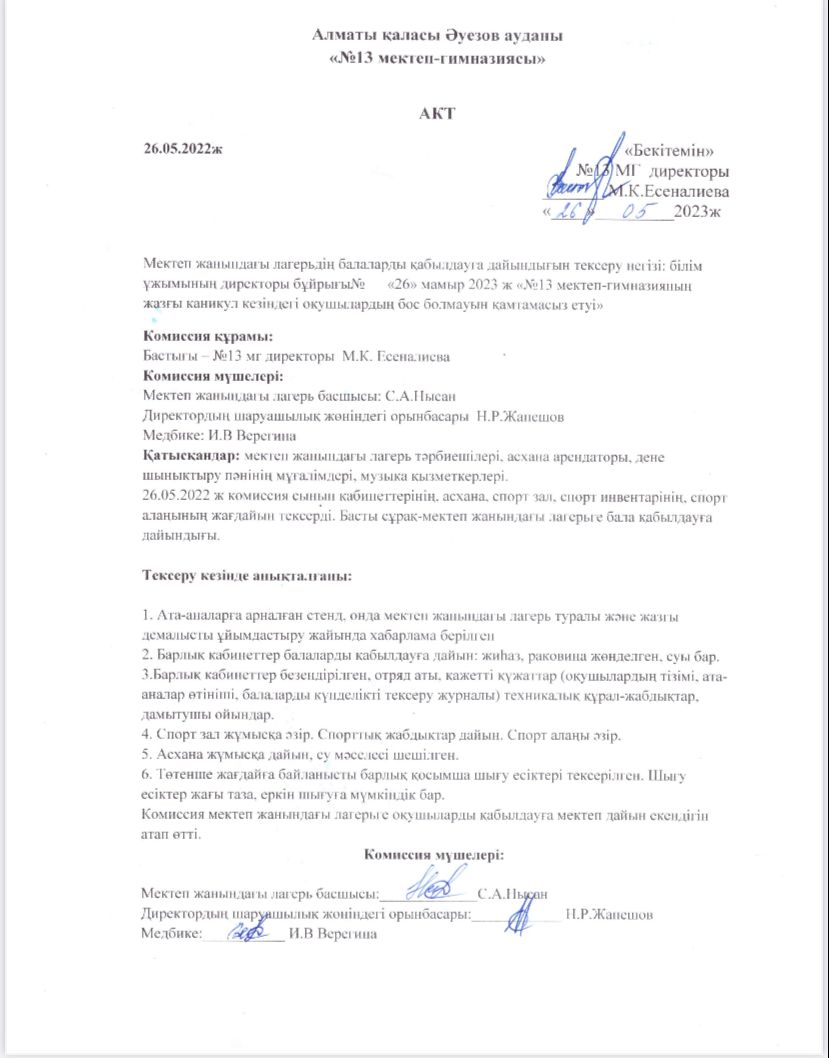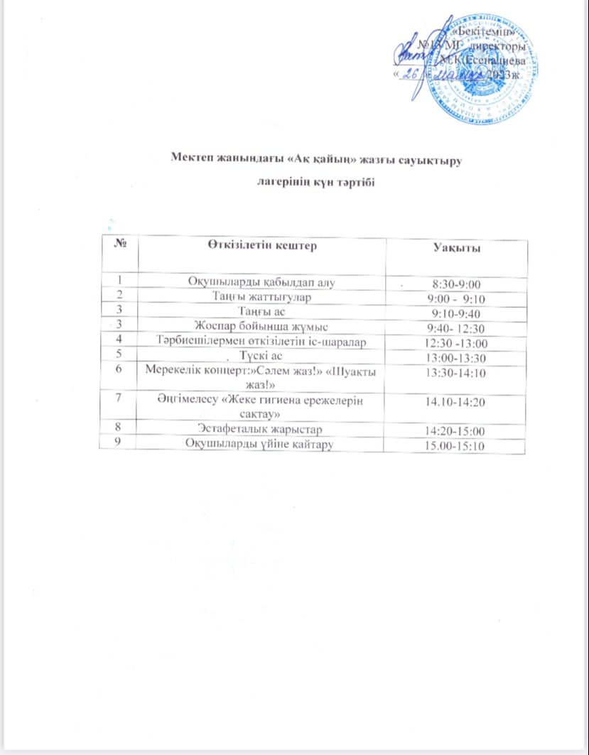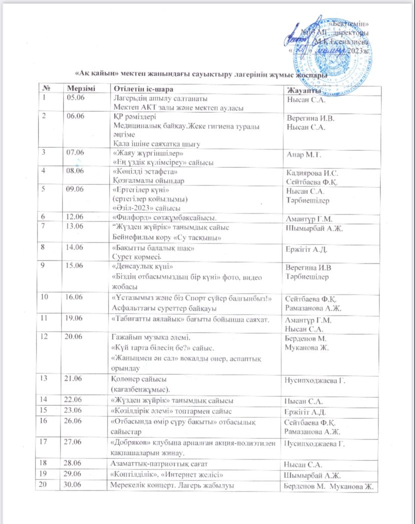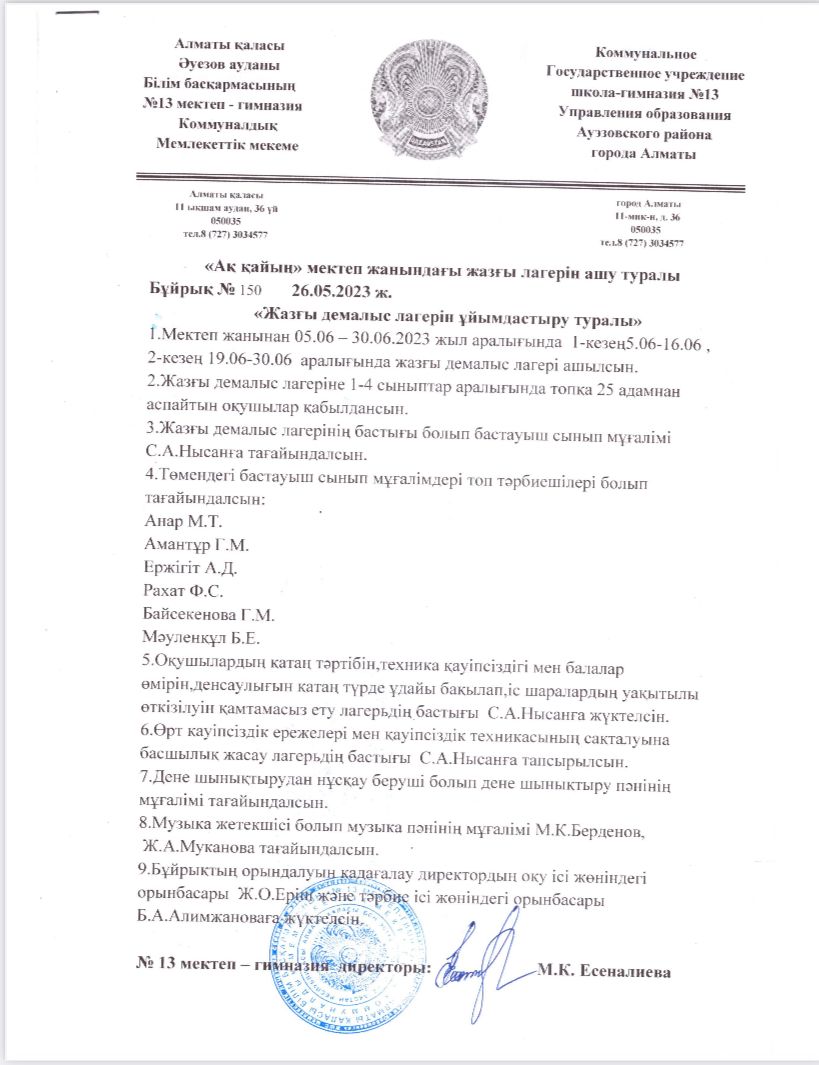 06 маусым 2023 0 1 2 3 4 5 «Ақ қайың» лагерінің жұмыс жоспары Алматы қаласы Әуезов ауданы №13 мектеп-гимназиясы жанындағы ұйымдастырылып отырған «Ақ қайың» лагерінің жұмыс жоспары. Осы беттің QR-коды:QR-код этой страницы: