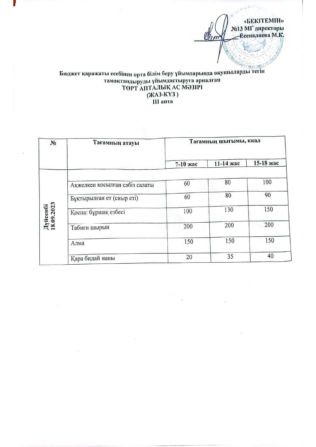 Меню 18.09.2023 » КГУ «Школа-гимназия №13» УО города Алматы