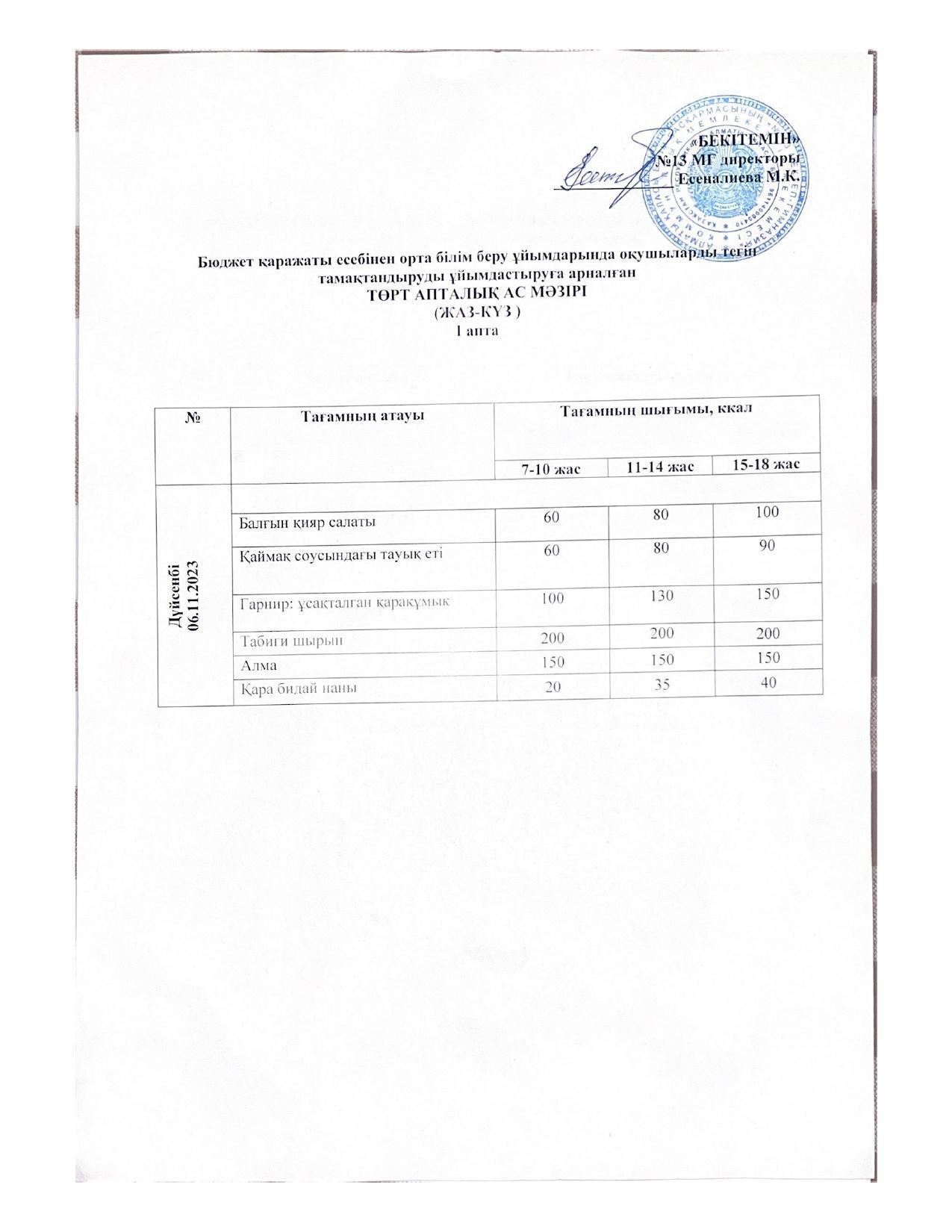 Меню 06.11.2023 » КГУ «Школа-гимназия №13» УО города Алматы