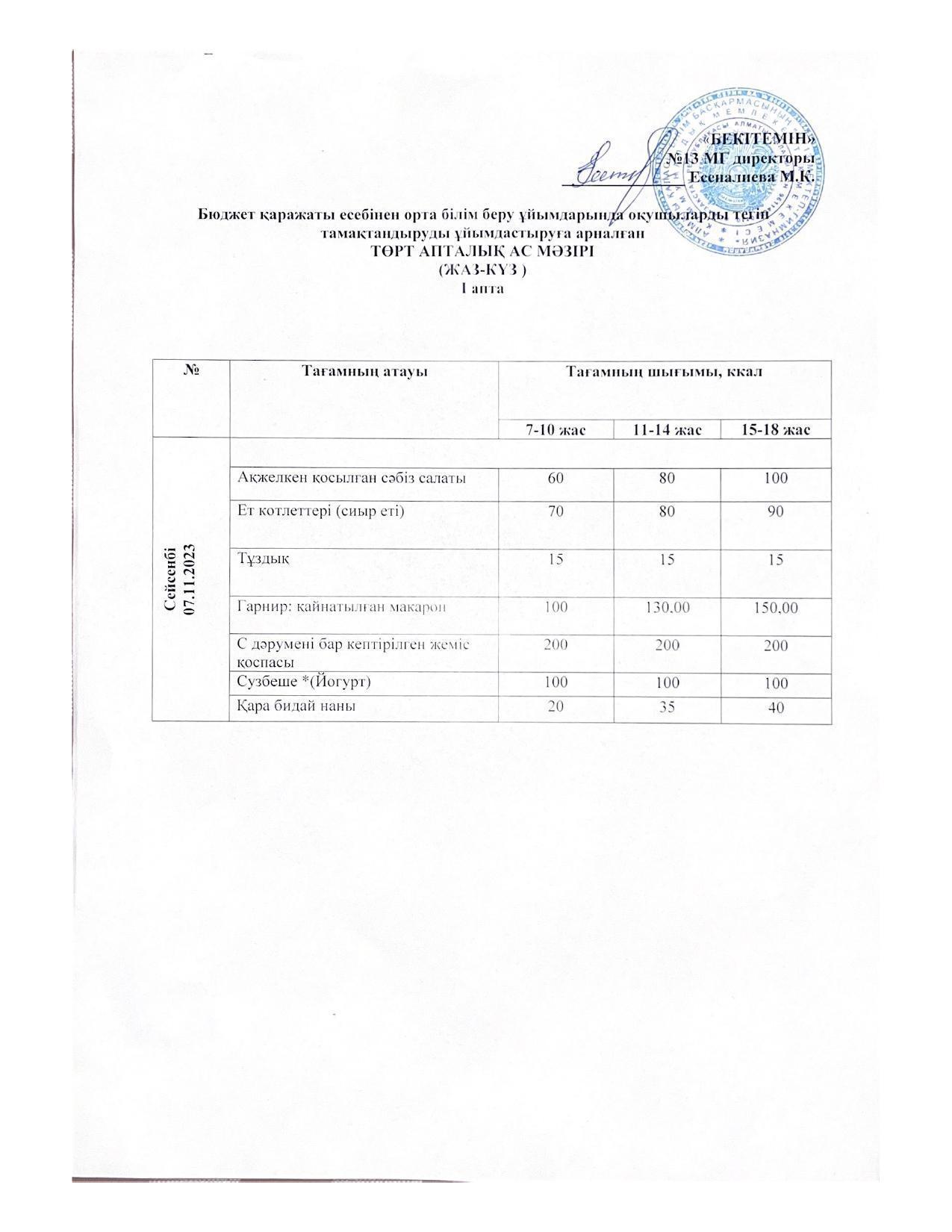 Меню 07.11.2023 » КГУ «Школа-гимназия №13» УО города Алматы