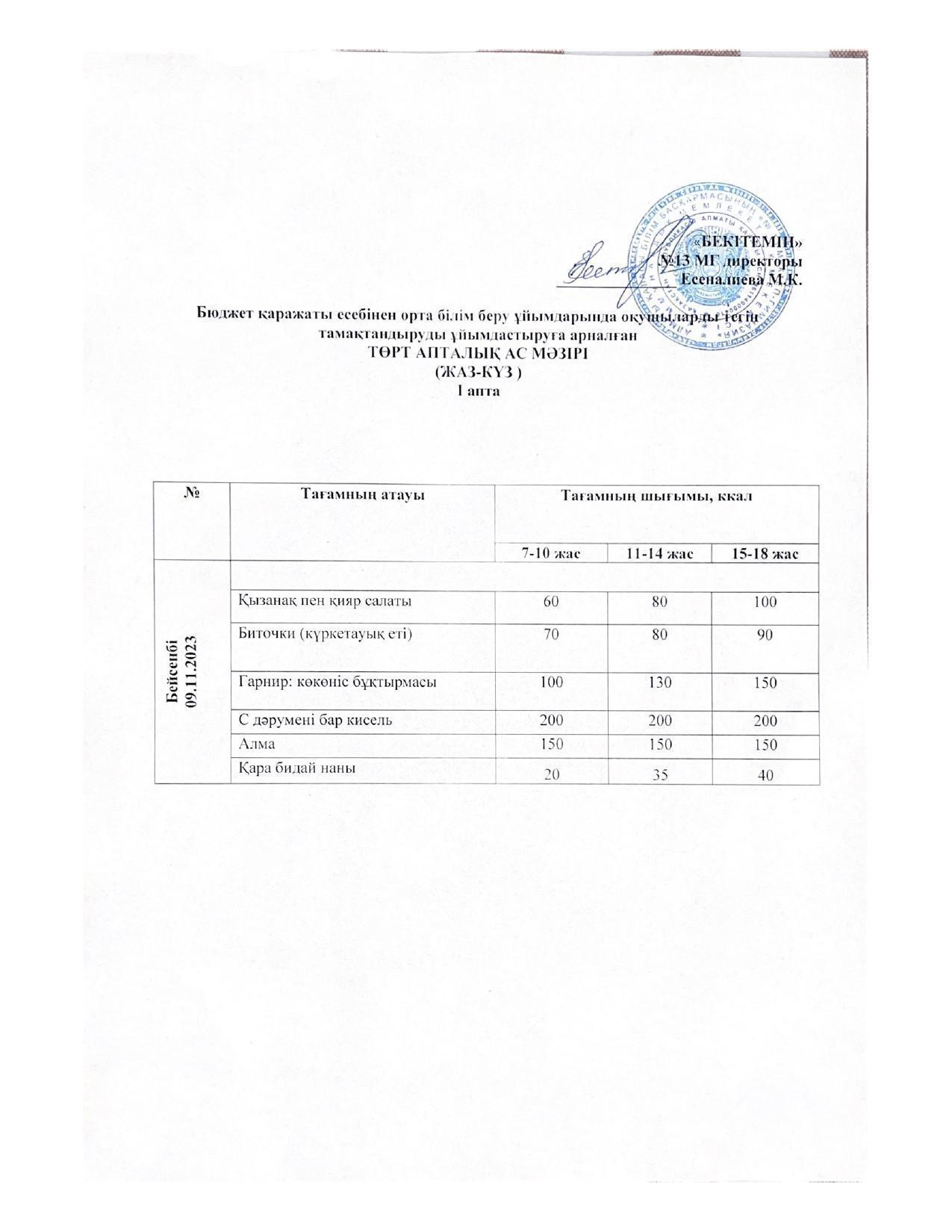 Меню 09.11.2023 » КГУ «Школа-гимназия №13» УО города Алматы