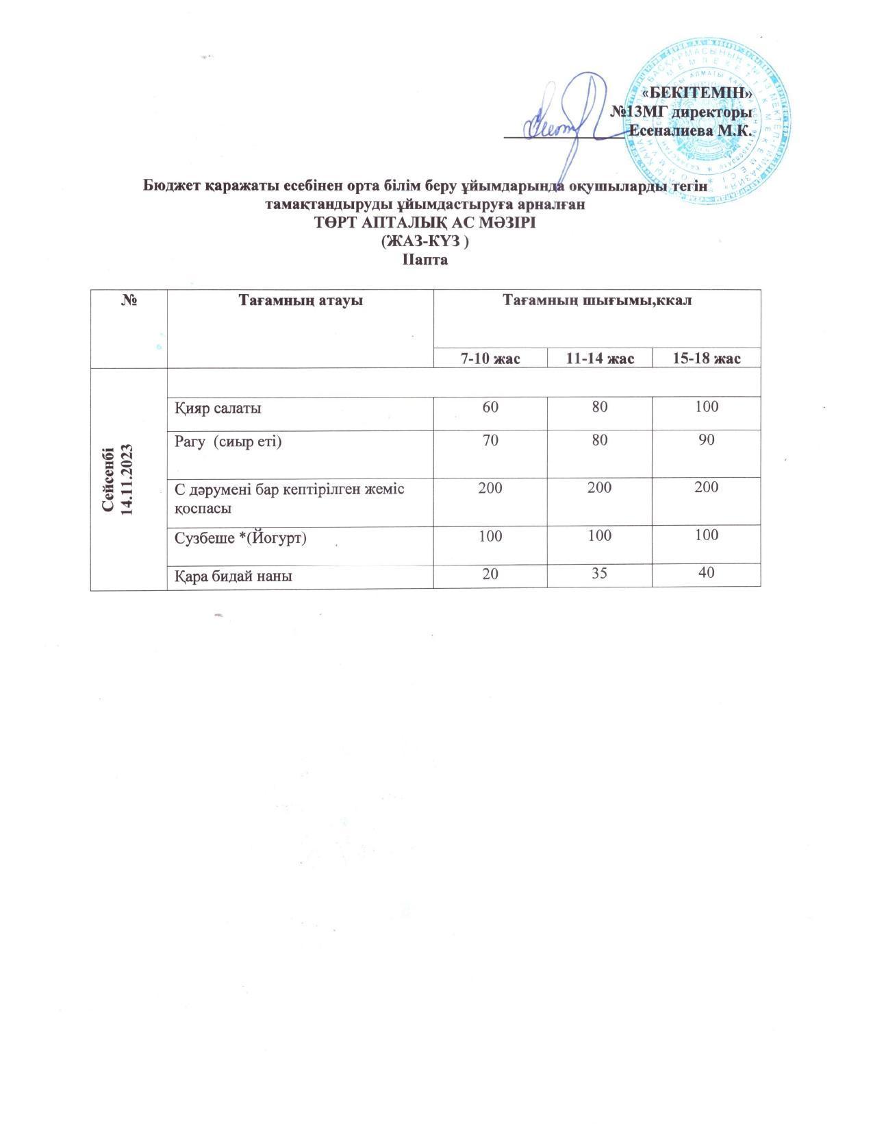 Меню 14.11.2023 » КГУ «Школа-гимназия №13» УО города Алматы