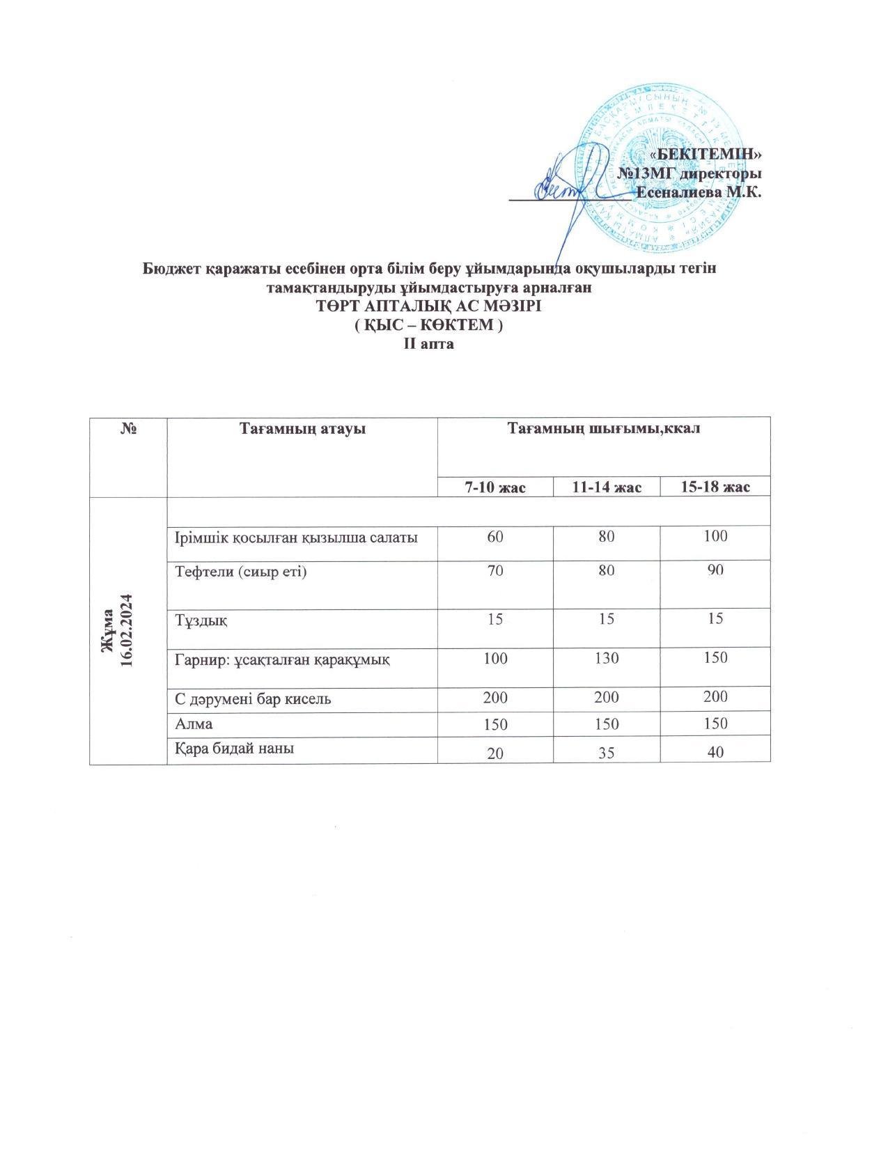 Меню 16.02.2024 » КГУ «Школа-гимназия №13» УО города Алматы