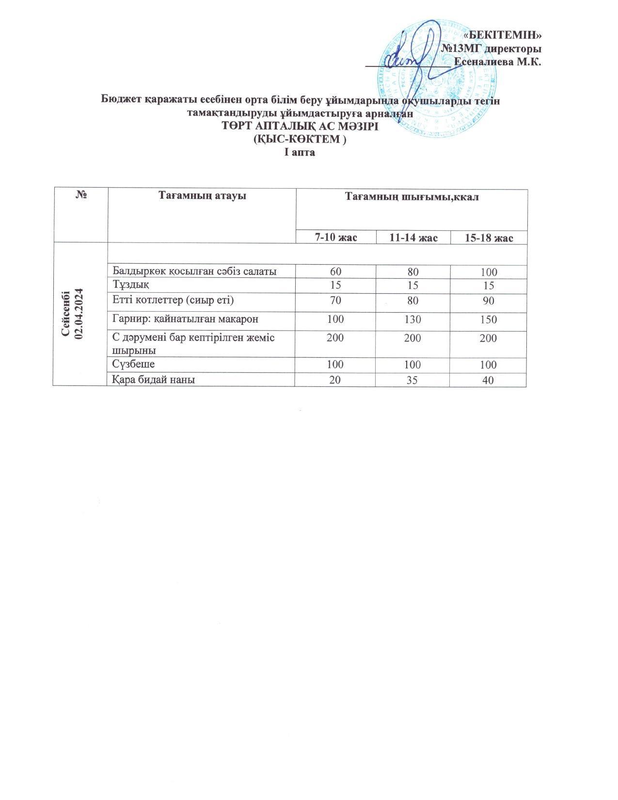 Меню 02.04.0024 » КГУ «Школа-гимназия №13» УО города Алматы