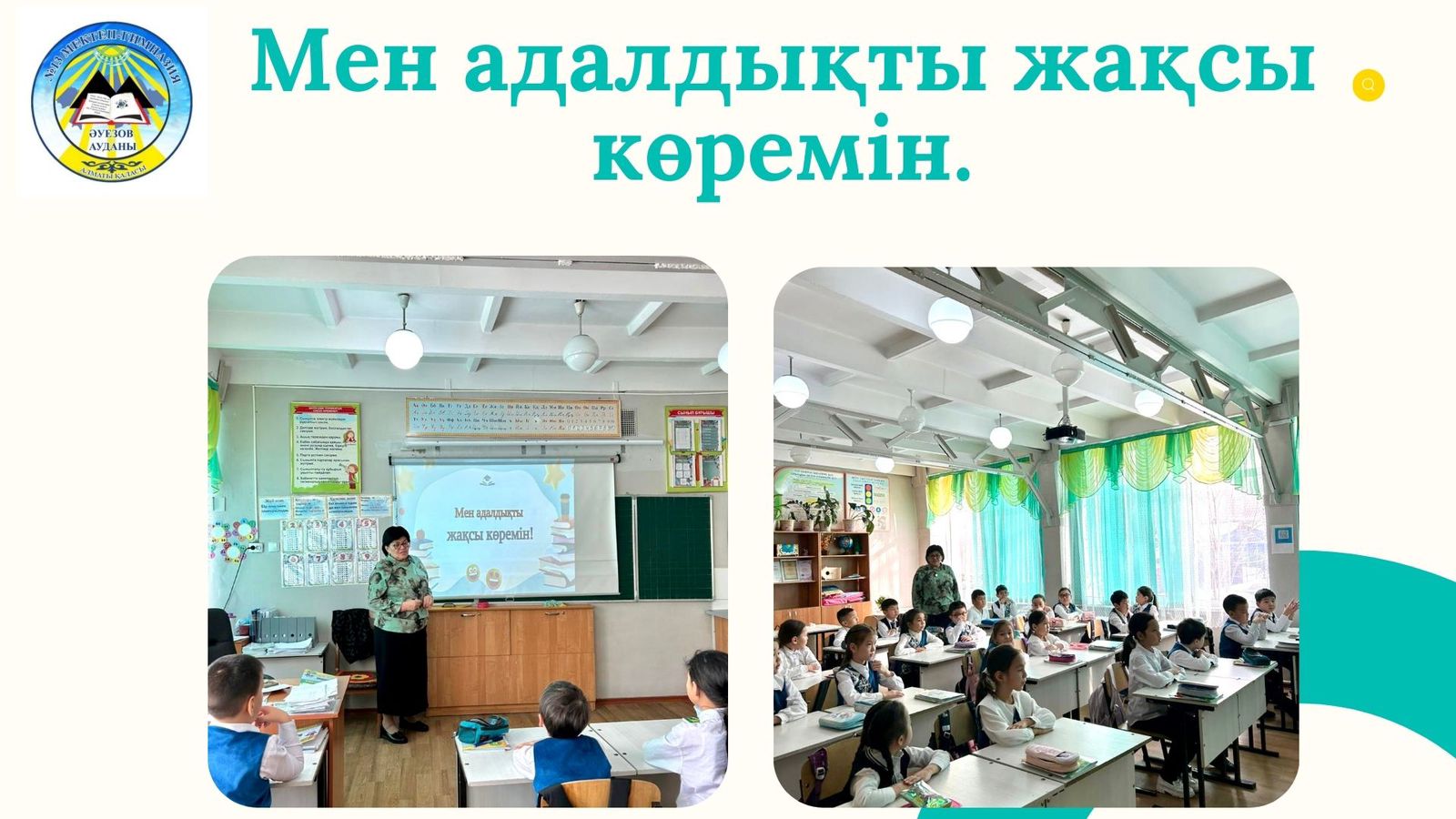 №13 мектеп-гимназиясының 2 «А» сыныбында «Адалдық сағаты» атты тәрбие сағаты өткізілді. Сағаттың мақсаты – оқушыларға әділдік пен ақиқаттың адам өміріндегі маңызын түсіндіріп, әділдік пен шыншылдық қасиеттерін дамытуға жағдай жасау болды. Сабақ барысында адалдықтың адамның жүрегінің тазалығы мен намысы екені айтылып, бұл қасиеттің адамның еліне, жанұясына және қоғамға деген адалдығынан байқалатыны түсіндірілді. Сонымен қатар, адалдық адамның өзін және өзгелерді құрметтеу мен қадірлеуінің белгісі екені ерекше атап өтілді.