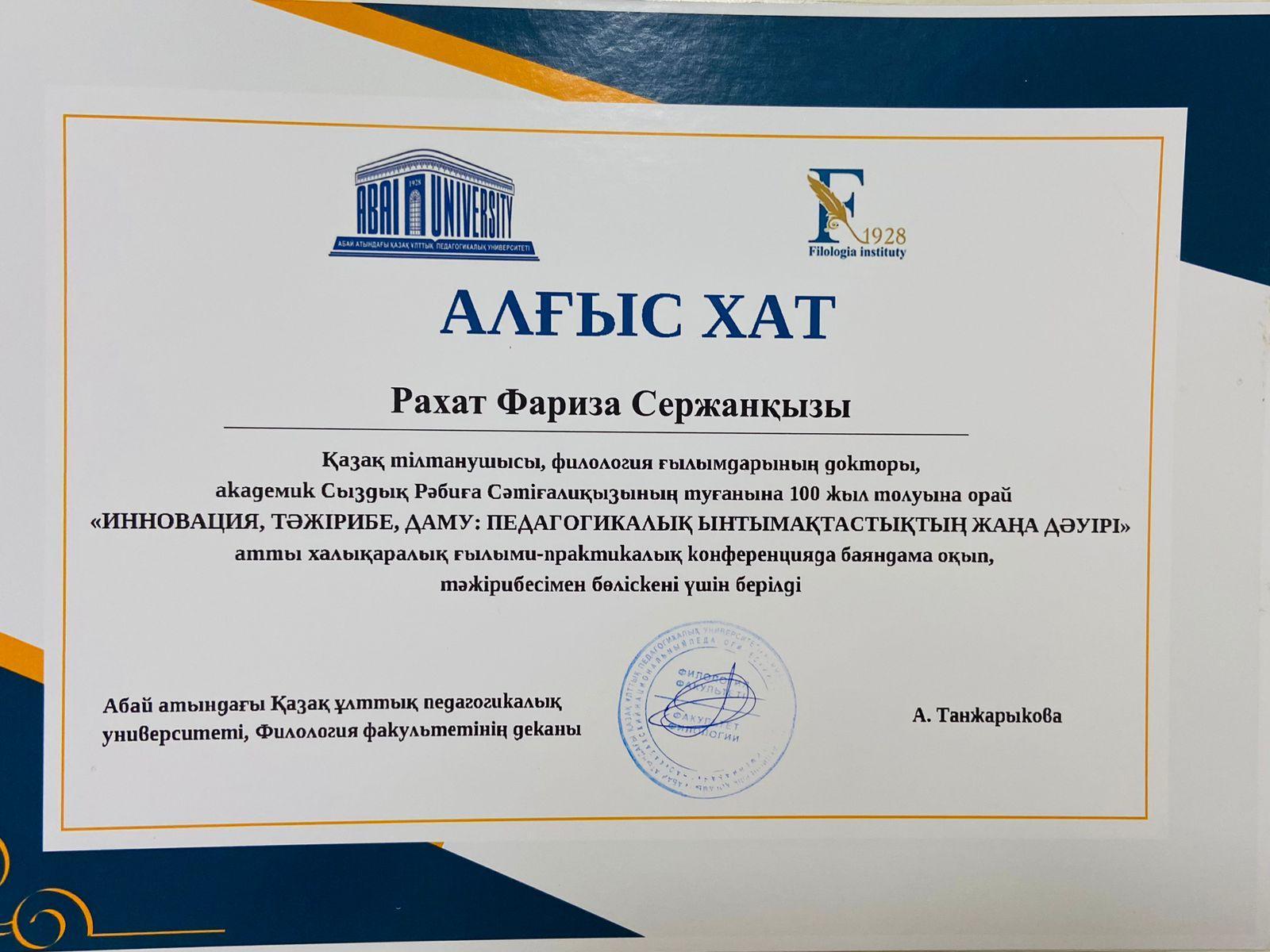 2025 жылдың 15 ақпанында қазақ тіл білімінің көрнекті қайраткері, филология ғылымдарының докторы, академик Рабиға Сыздықтың 100 жылдығына арналған «Инновация, тәжірибе, даму: педагогикалық ынтымақтастықтың жаңа дәуірі» атты халықаралық ғылыми-практикалық конференция өтті. Бұл конференция Абай атындағы Қазақ ұлттық педагогикалық университетінің Филология факультетімен бірлесіп ұйымдастырылды.