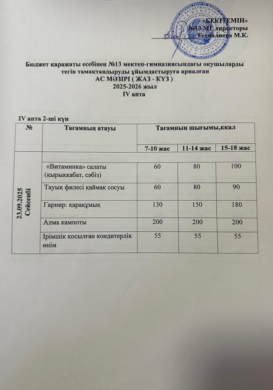 Ас мәзірі 23.09.2025 » КГУ «Школа-гимназия №13» УО города Алматы